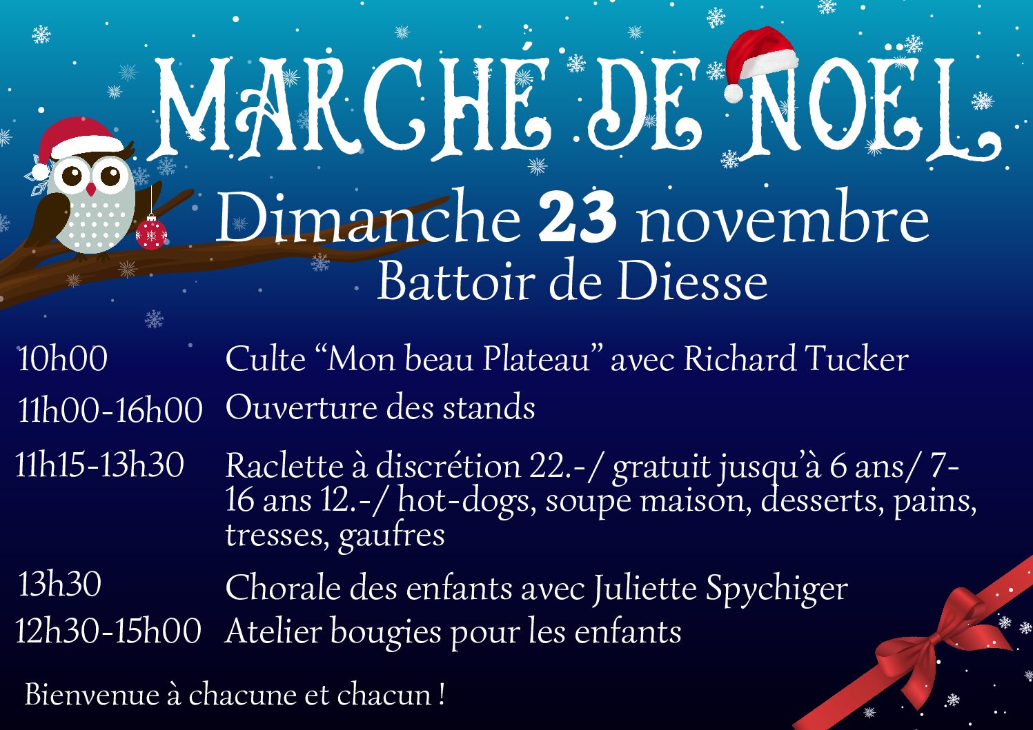 Marché de Noël à la salle du Battoir de Diesse dimanche 23 novembre, 10h Culte « Mon Beau Plateau » avec Richard Tucker photographe.