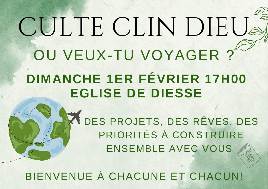 Culte Clin Dieu. Où veux-tu voyager ? Des projets, des rêves, des priorités à construire ensemble avec vous…Dimanche 01 février, église de Diesse 17h00 accueil culte26 janvier 202626 janvier 2026 Katia Schneider Continuer la lecture